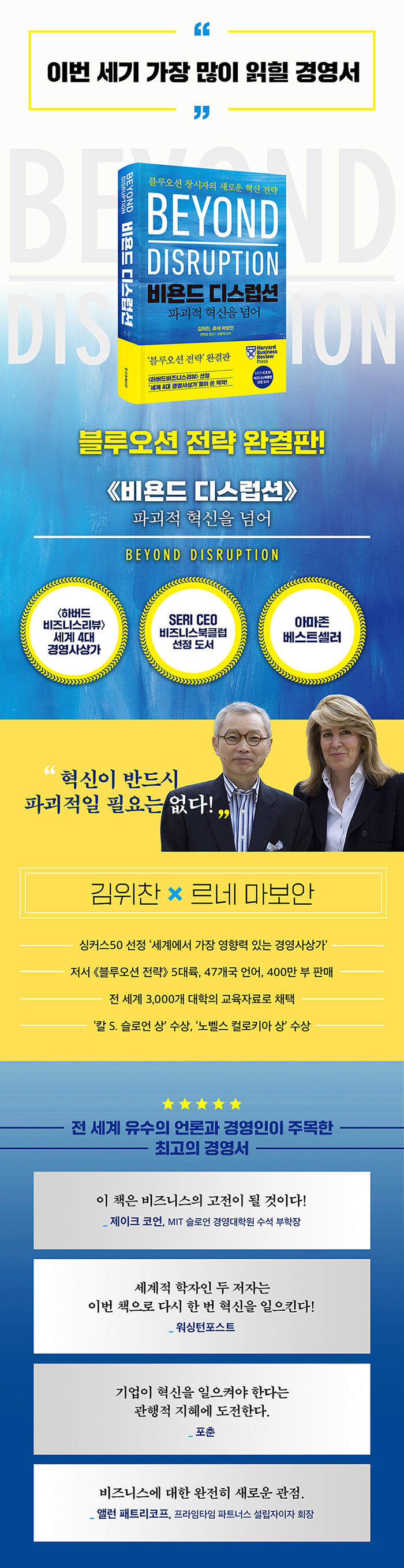 《블루오션 전략》이 경쟁이 아닌 창조를 전략의 본질로 재정의했다면, 이 책 《비욘드 디스럽션》은 혁신에 대한 기존 시각을 재정의하고 확장함으로써, 혁신의 새로운 접근 방식에 눈 뜨고 새로운 시장을 열어갈 수 있는 획기적인 기회를 선사한다.