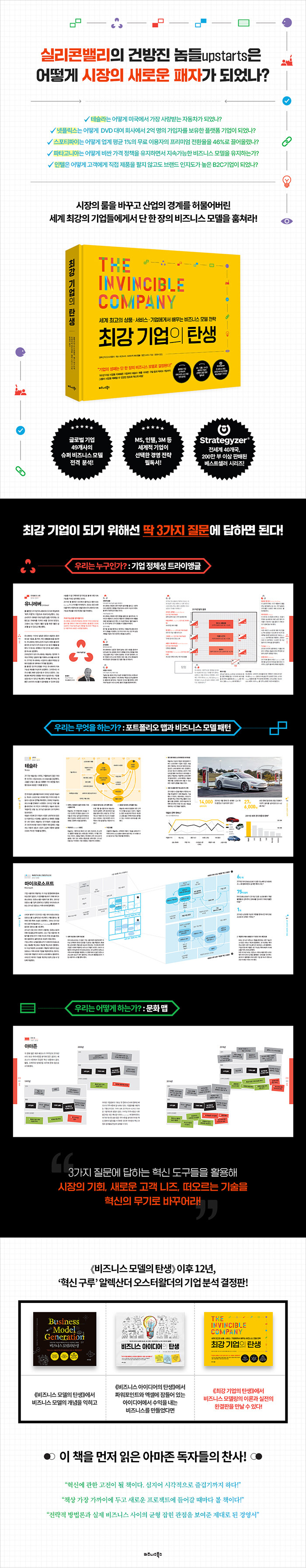 책에서는 이들의 성공 요인을 철저히 분석하고 이를 모든 기업가와 혁신가, 프로젝트 리더가 적용할 수 있도록 포트폴리오 맵, 비즈니스 모델 패턴, 기업 정체성 트라이앵글, 문화 맵 등의 도구를 제시한다. 또한 이 혁신적인 경영 도구들의 개념과 활용법, 이를 실제 비즈니스에 적용해 성공한 최강 기업의 사례까지 자세히 알려준다.
